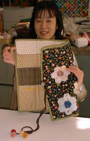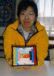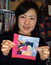 | My first quilt with Log cabin by Naoko Ohtani | Pillow case with Le Moyne Star by Akiko Namekawa | Shoulder bag with one patch by Harumi Minami | |||
