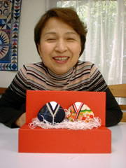 | Sewing bag by Chizuko Ohtsuki | Ohinasa doll with cram shells by Misako Yoshida | Pillow case with Log-heart by Izumi Koya | |||