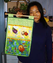| Inside of a sewing bag with junk blocks by Noriko Seki | Outside of a sewing bag with junk blocks by Noriko Seki | Wall pocket with Easy applique by Kana Kinoshita | |||