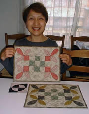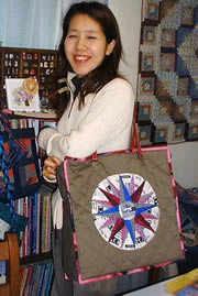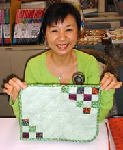 | Mat with Nine-patch by Kyoko Ogura | Porch with Log-cabin by Yuko Ohtani | Tout bag with mariner's Compass by Harumi Minami | |||