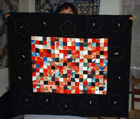 Wall hanging using kimono silk with Postage Stamps by Chizuko Otsuki