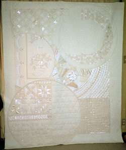 01/From Lesson One 1995 ハーツ&ハンズキルトショー展示 180cm×230cm 白、オフホワイトのコットン、シルク、化学繊維、 レース、オーガンジー、花嫁衣装、ボタンなど カテドラルウィンドウ、キャンドルウィック、ヨーヨー、 クレイジー、スラッシュ、ピンタック、タックドウェーブ、 ボルティモア風アップリケ、ピーシングと、 なるべく多くのテクニックを使い、 それを見せるために 色は「白」にしぼりました。 初心に戻って作ったつもりでタイトルも「レッスン1から」。 |